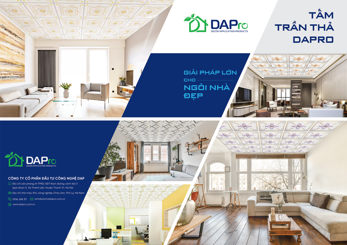Tấm trần thả DAPro là một trong những vật liệu ngày càng được ưa chuộng trong giới tiêu dùng ngành nội thất. Với những tính năng ưu việt như màu sắc đa dạng, bề mặt phẳng, nhẵn, chống thấm nước, chống nóng, nhẹ, tấm trần thả DAPro là giải pháp hiệu quả, thuận tiện cho quá trình gia công đơn giản và kinh tế.