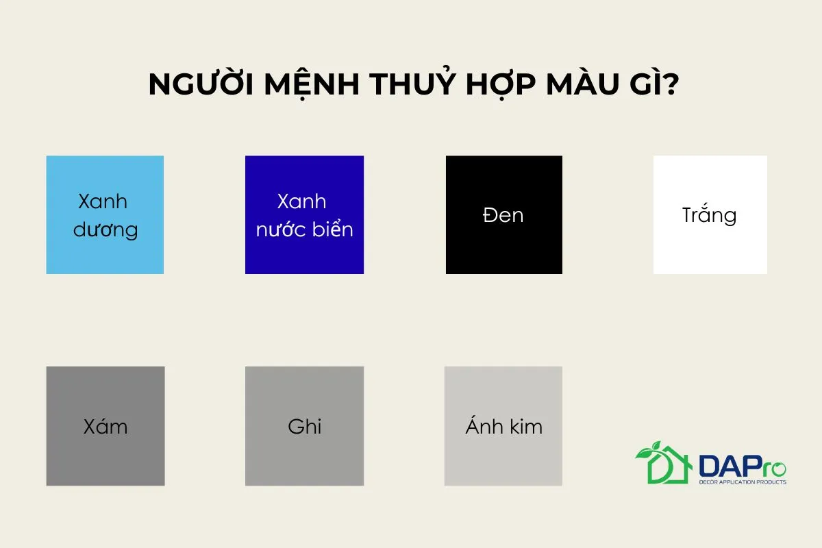 Mệnh Thủy tượng trưng cho nước – yếu tố của sự linh hoạt, mềm mại nhưng cũng đầy sức mạnh tiềm ẩn. Xét theo nguyên lý ngũ hành, người mệnh Thủy hợp nhất với hai nhóm màu: màu tương hợp (thuộc hành Thủy) và màu tương sinh (thuộc hành Kim).